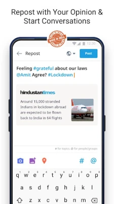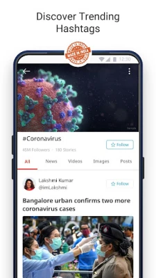 यह सिर्फ पढ़ने या देखने का मंच नहीं, बल्कि विचारों के आदान-प्रदान और नए रुझान स्थापित करने का स्थान है। अपनी अनूठी प्रोफाइल बनाएं, अपने विचारों और अनुभवों को पोस्ट के माध्यम से साझा करें। दिलचस्प कंटेंट खोजें, लोगों को टैग करें, प्रभावी हैशटैग का उपयोग करें, और अपनी बात कहें। क्या कोई लेख आपको पसंद आया या आपने किसी विचार से असहमति जताई? बस रीपोस्ट करें, अपनी राय व्यक्त करें, और सार्थक चर्चाओं को जन्म दें। अपनी गैलरी से तस्वीरें, मजेदार मीम्स, व्यक्तिगत वीडियो या पसंदीदा लेखों के लिंक लाकर Dailyhunt समुदाय के साथ साझा करके आप अपनी दुनिया को और भी विस्तृत कर सकते हैं।