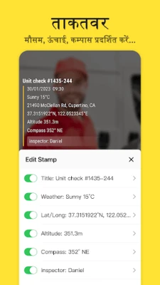 **टाइमस्टैम्प कैमरा** की पहचान इसकी त्रुटिहीन सटीकता है। **टाइमस्टैम्प कैमरा टेक्नोलॉजी लैब** द्वारा सत्यापित, ऐप यह सुनिश्चित करता है कि प्रत्येक तस्वीर पर अंकित समय यूनिवर्सल टाइम (UTC) के अनुरूप हो, जिसे आपके स्थानीय समय क्षेत्र में बिल्कुल सही ढंग से प्रदर्शित किया जाता है और इसे बदला नहीं जा सकता। आप अपनी तस्वीरों पर जीपीएस स्थान, सटीक पता, मानचित्र, वर्तमान मौसम, कम्पास दिशा, ऊंचाई, देशांतर, अक्षांश, अज़ीमुथ, ज़िप कोड, कस्टम टैग, परियोजना का नाम, निरीक्षण विवरण और संपादन योग्य नोट्स जैसी बहुमूल्य जानकारी को सहजता से जोड़ सकते हैं। यह अनुकूलन क्षमता आपको अपनी कैप्चर की गई जानकारी को अपनी विशिष्ट आवश्यकताओं के अनुसार ढालने की शक्ति देती है, हर दस्तावेज़ को पूर्ण और अकाट्य बनाती है।